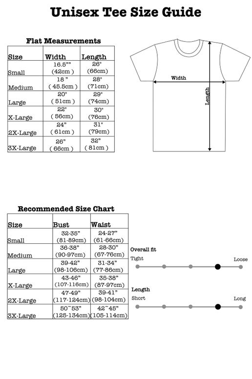 Actual shirt measurements- (Measurements are in inches with shirt laying flat) Small / Body Width 16.5” (42cm) Medium / Body Width 18” (45.5cm) Large / Body Width 20″ (51cm) Extra Large / Body Width 22″ ( 56cm) 2X-Large / Body Width 24” (61cm) 3X-Large / Body Width 26″ (66cm)